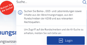 Nutzen Sie die leistungsfähige Suchfunktion zum schnelleren Auffinden bestimmter Bema-, GOZ- und Laborleistungen, von Inhalten aus Rundschreiben der KZVB sowie aus relevanten Rechtsquellen. Bereits bei der Eingabe werden Suchvorschläge angezeigt, die Sie per Klick direkt zu den gewünschten Artikeln führen. Alternativ werden Ihnen die Suchergebnisse gegliedert nach Thematik (Abrechnungsmappe, Rundschreiben, Rechtsquellen) in einer Liste angezeigt, die auch noch sichtbar bleibt, wenn Sie einen Artikel auswählen.