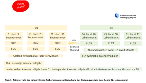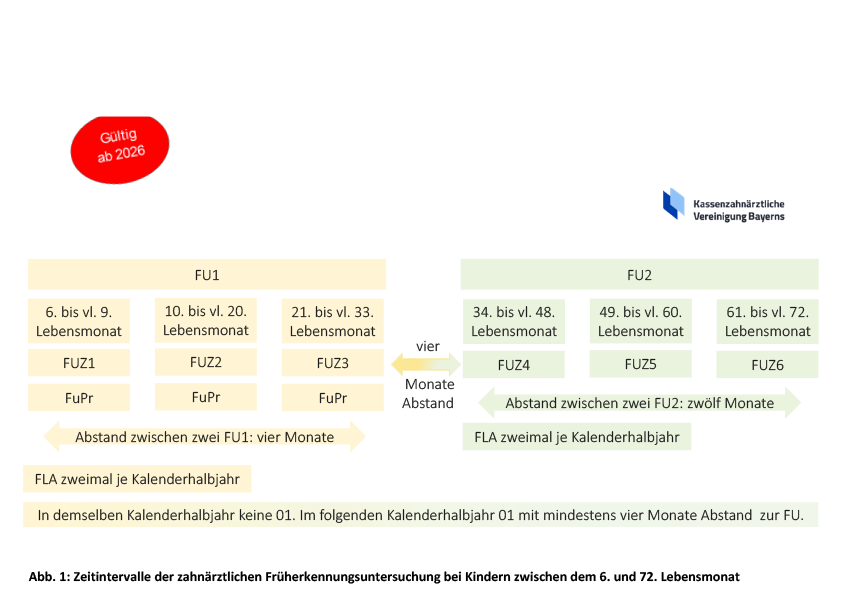Nach § 4 Teil B der FU-Richtlinie sind die Intervalle der zahnärztlichen Früherkennungsuntersuchungen nach Bema-Nr. FU1 vorgegeben: